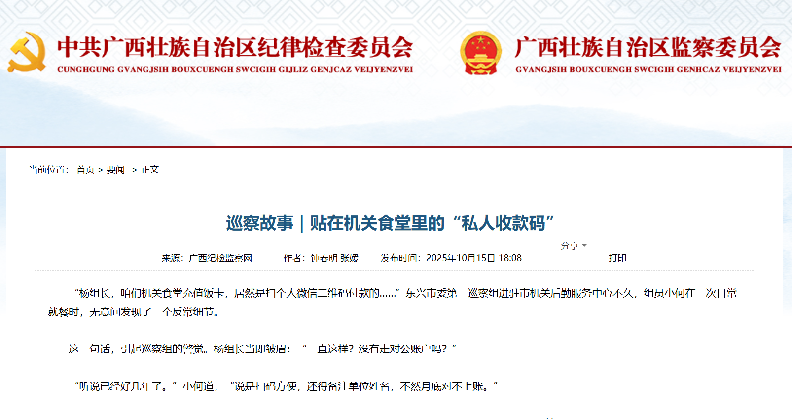 廣西紀檢監(jiān)察網(wǎng)|巡察故事|貼在機關(guān)食堂里的“私人收款碼”